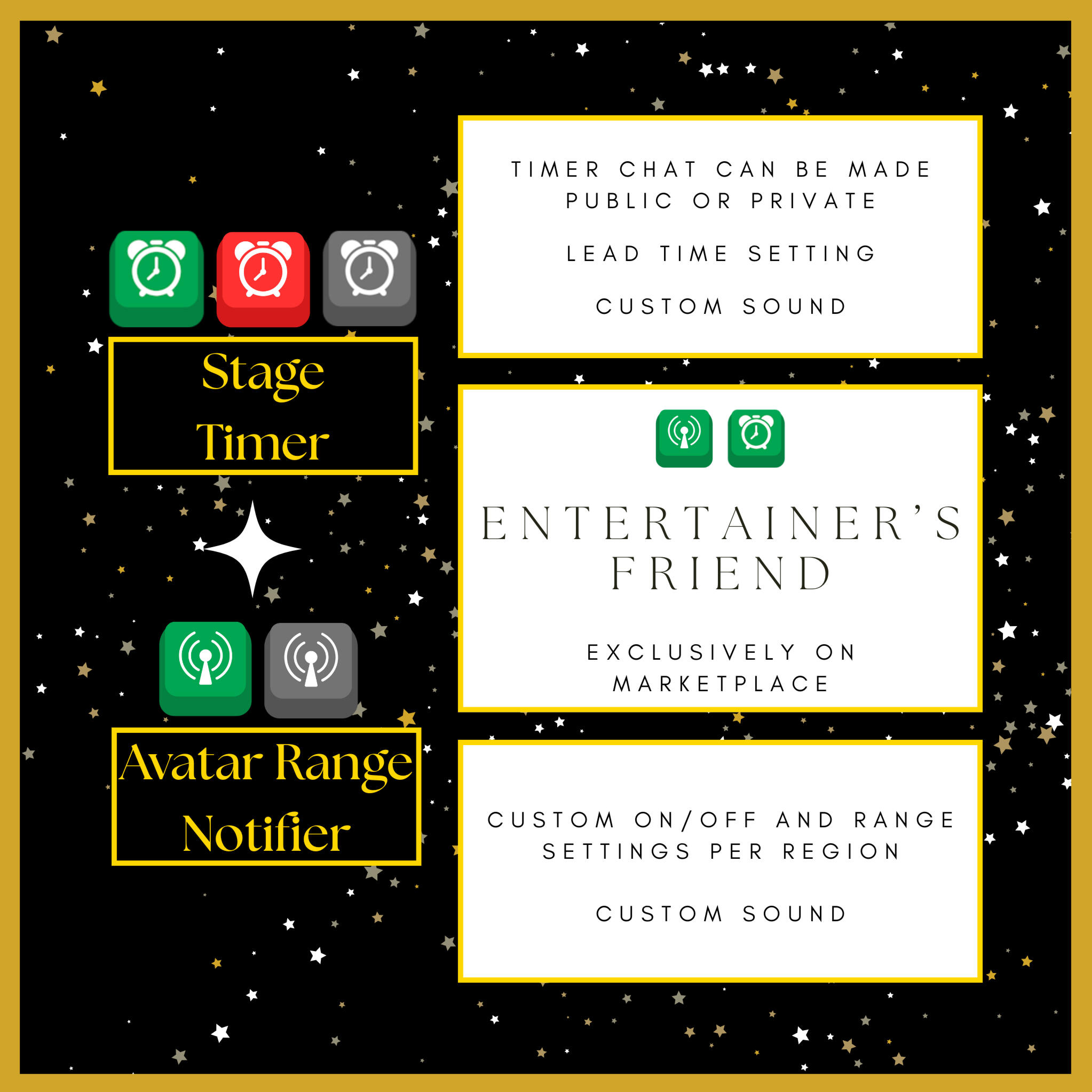 Are you alt-tabbing back and forth, and wondering if someone new arrived in your chat range? Say no more!This HUD plays a customizable sound whenever someone new enters the set range in the regions you set it to. It also sends you a private message in local with who just entered the range and how far away they are.The best part about this HUD is that you can set and forget -- only get notified in regions you care for!This stage timer has a customizable sound and you can set it to post updates on local chat or private to you. You also have the default option of having an extra countdown for you to prepare before you begin your service.For a more robust Entertainer's experience, purchase Entertainer's Accountant which comes with Entertainer's Friend!