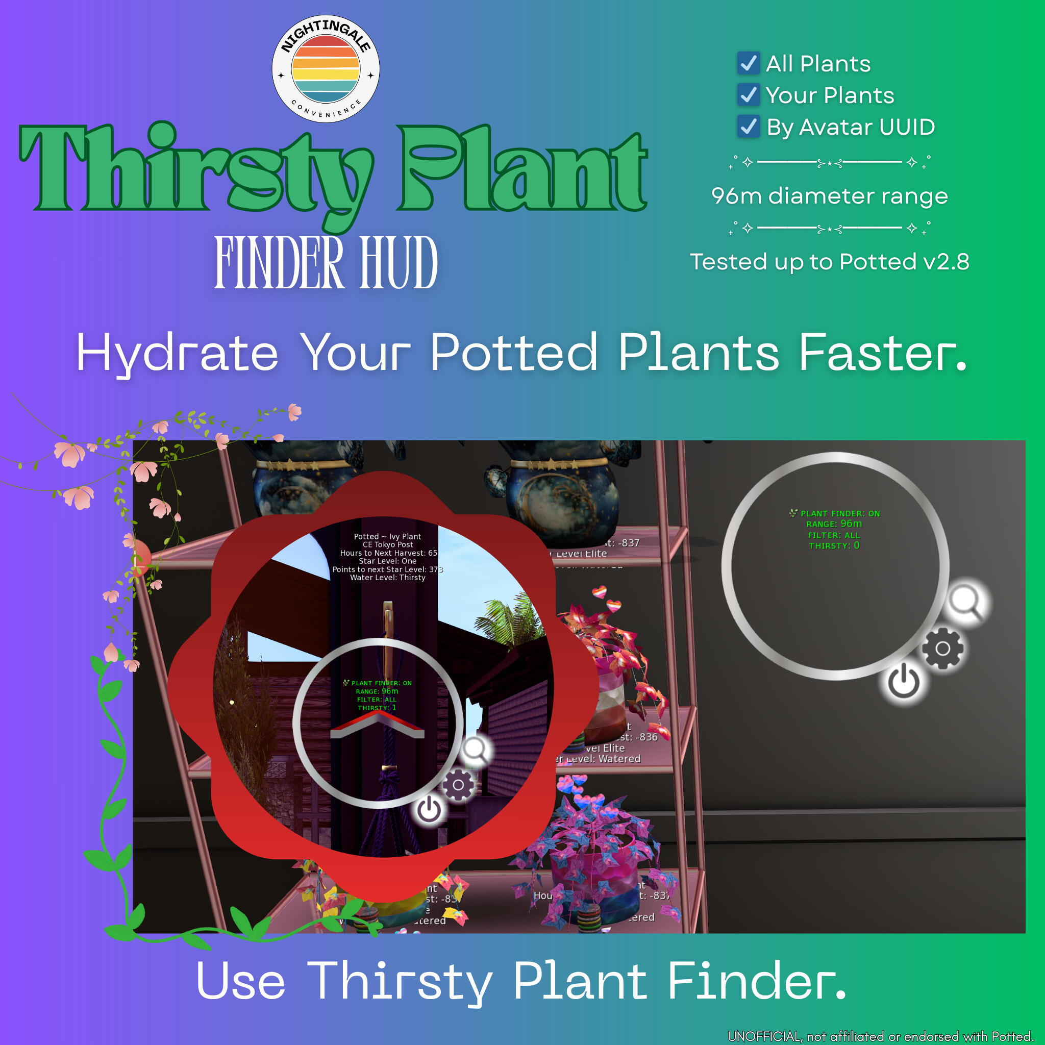 Welcome to the Thirsty Plant Finder HUD!This handy tool helps you locate nearby thirsty plants that need watering, pointing you in the right direction so you never miss a thirsty plant again.Three filter options are available:ALL - The HUD will find thirsty plants regardless of who owns them. This is the default setting.MINE - The HUD will only find thirsty plants that belong to you.UUID - The HUD will only find thirsty plants belonging to a specific person. Selecting this option will open a text box prompting you to enter the UUID of the avatar whose plants you want to track. The HUD will validate the UUID and confirm the avatar's name before applying the filter.* Disclaimer - This is an UNOFFICIAL product. I am not affiliated with Potted nor endorsed by them in any way.