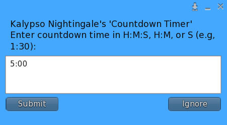 This HUD button can replace your phone timer for your SL countdown timer needs. You just need to know how long to run the countdown timer for.The format is Hours:Minutes:Seconds. You can do H:M:S, M:S, or just seconds. You can also say 90 seconds and it will translate to 1:30.