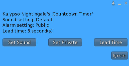 The lead time by default is 5 seconds. The lead time will give you a bit of time to prepare for your stage service.The public/private setting makes it so that the timer would post to local chat or just to you. By default, the timer posts to local chat.Note that the sound will only be heard by you, however.